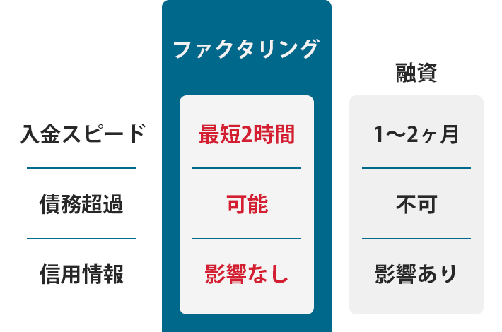 そんなときの資金繰りにこのような、融資では対応できない資金調達方法が「ファクタリング」です!お持ちの売掛金をファクタリング会社に売却することで、売掛金の支払期日より前に資金化したり、売掛金の未回収リスク軽減を図るサービスです。